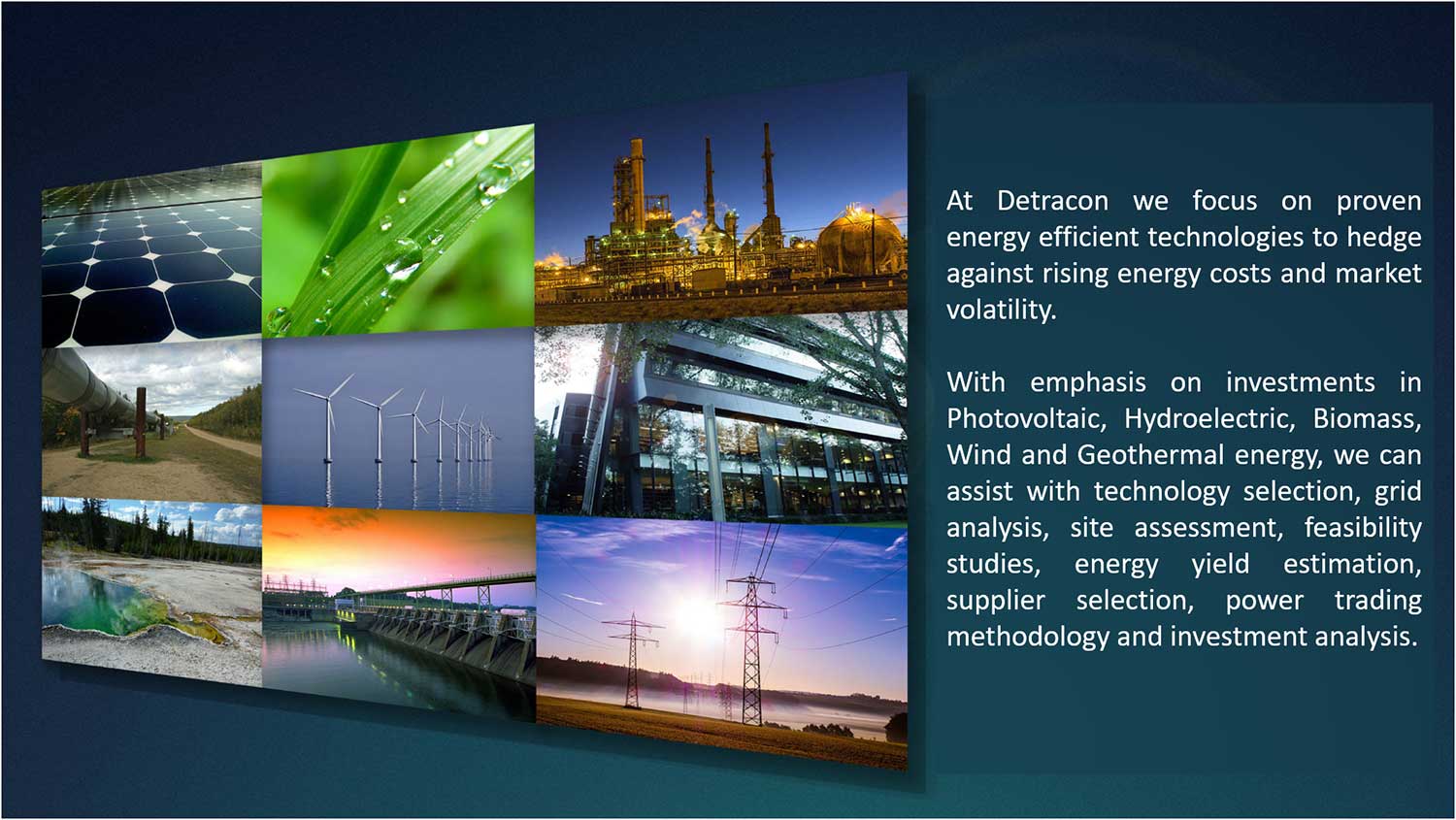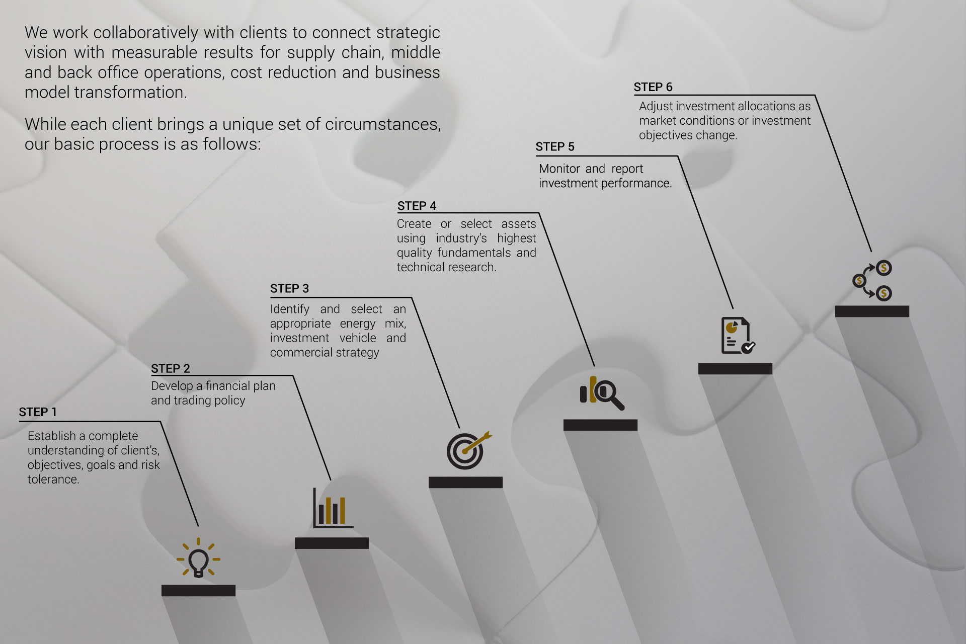 To assist our clients across the energy spectrum achieve these goals, we deliver an extensive understanding of regulatory processes, pricing, supply-and-demand dynamics, fundamental analysis, product sourcing, financial modelling and back office operations.